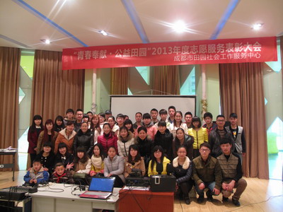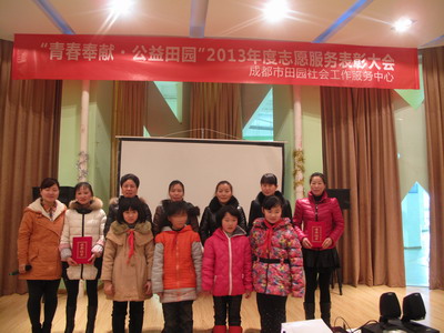 2014年3月2日上午九点,成都市田园社会工作服务中心“青春奉献,公益田园”2013年度志愿者表彰大会在温江区万春青少年空间举行。本次志愿服务表彰大会共有田园社工服务中心11个项目点参与评选,本次表彰大会一共有四个奖项:田园优秀志愿服务团队、田园优秀志愿者、田园星级志愿服务团队、田园星级志愿者。
