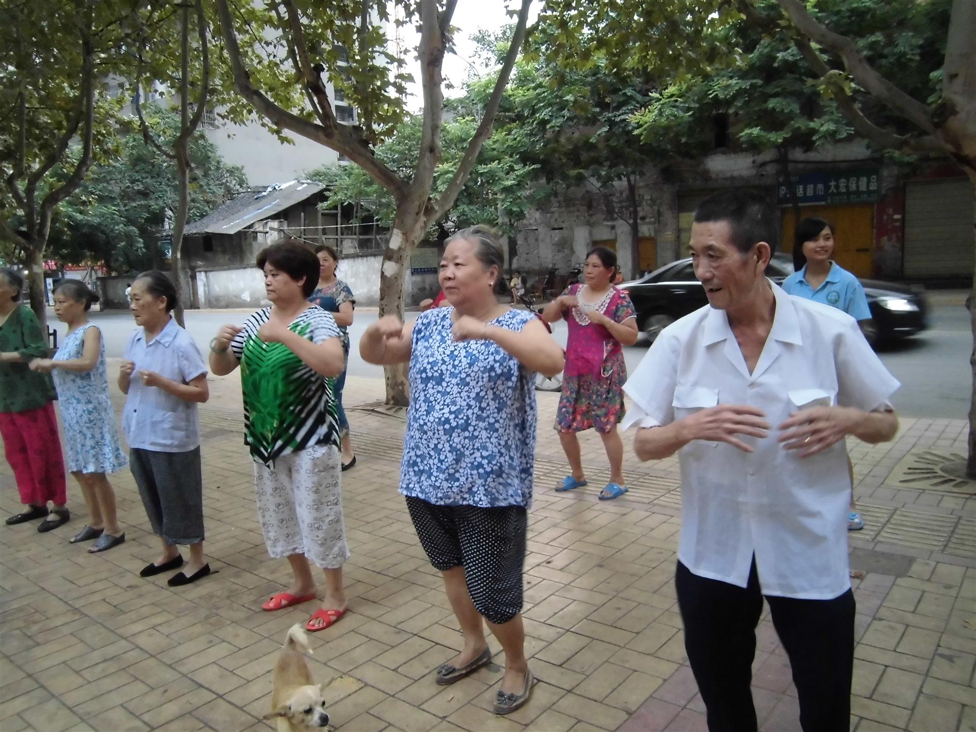 16日早上,社工来到活动现场时,只有几个居民在那里。但是当健身操的音乐响起,社工带领大家跳起时,却吸引了不少路人停下脚步,参与到跳健美操的队伍中来。在跳健美操的人群中,老年人占了大多数。社工根据老年人的生理特点,安排他们站在前排,以便他们能清楚的听到音乐和看到带领者的动作。社工耐心、细致地教老年人每一个动作,直到他们学会。