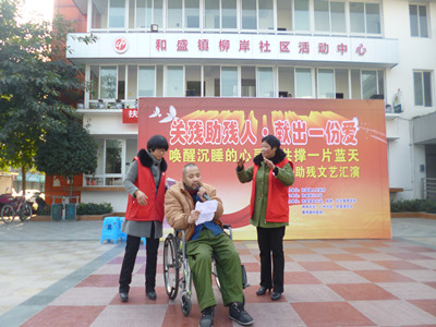 寒冬腊月,冻结了万物却冻结不了暖暖人心。为引起社会对残疾人群体的关注,促进我镇残疾人事业发展,进一步弘扬人道主义精神,宣传扶残助残工作,丰富残疾人精神文化生活。2014年12月21日,由和盛镇党委政府主办,和盛社工站承办,和盛镇残联、文化站、社区教育学校等单位协办的“关爱残疾人·献出一份爱”主题文艺汇演在柳岸社区广场顺利开展。来自高校以及社区居民的各个表演团体倾情奉献了一台精彩的文艺表演,本次活动参与人员达600余人。